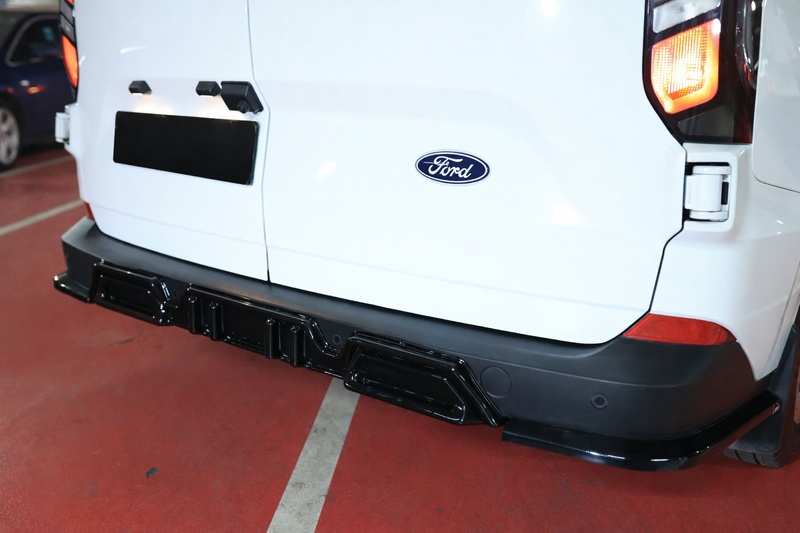 Geef jouw Ford Transit Custom 2024+/VW T7 2025+ een sportieve upgrade met de Rear Side Splitter in glans zwart, 2-delig van Kiedan. Deze splitters combineren een strak design met duurzaamheid en past naadloos op de originele achterbumper.
